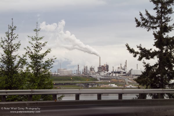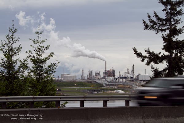 This shot has a shutter speed of 3.2 second and, unless you are looking carefully, you will not notice the very faint streaks of a car in the near lane. The streaks can be seen just above the guardrail in front of the tree on the right. Lastly, with the VND on maximum, a shutter speed of 10 seconds is achieved and no cars are visible, as well as a greater streaking to the steam from the stack in the distance.