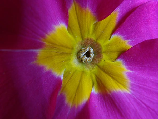 The magnification in this shot of a primula is impressive, though in Super Macro mode the lens is so close that it's obscuring the light and a little artificial illumination was needed from the side.