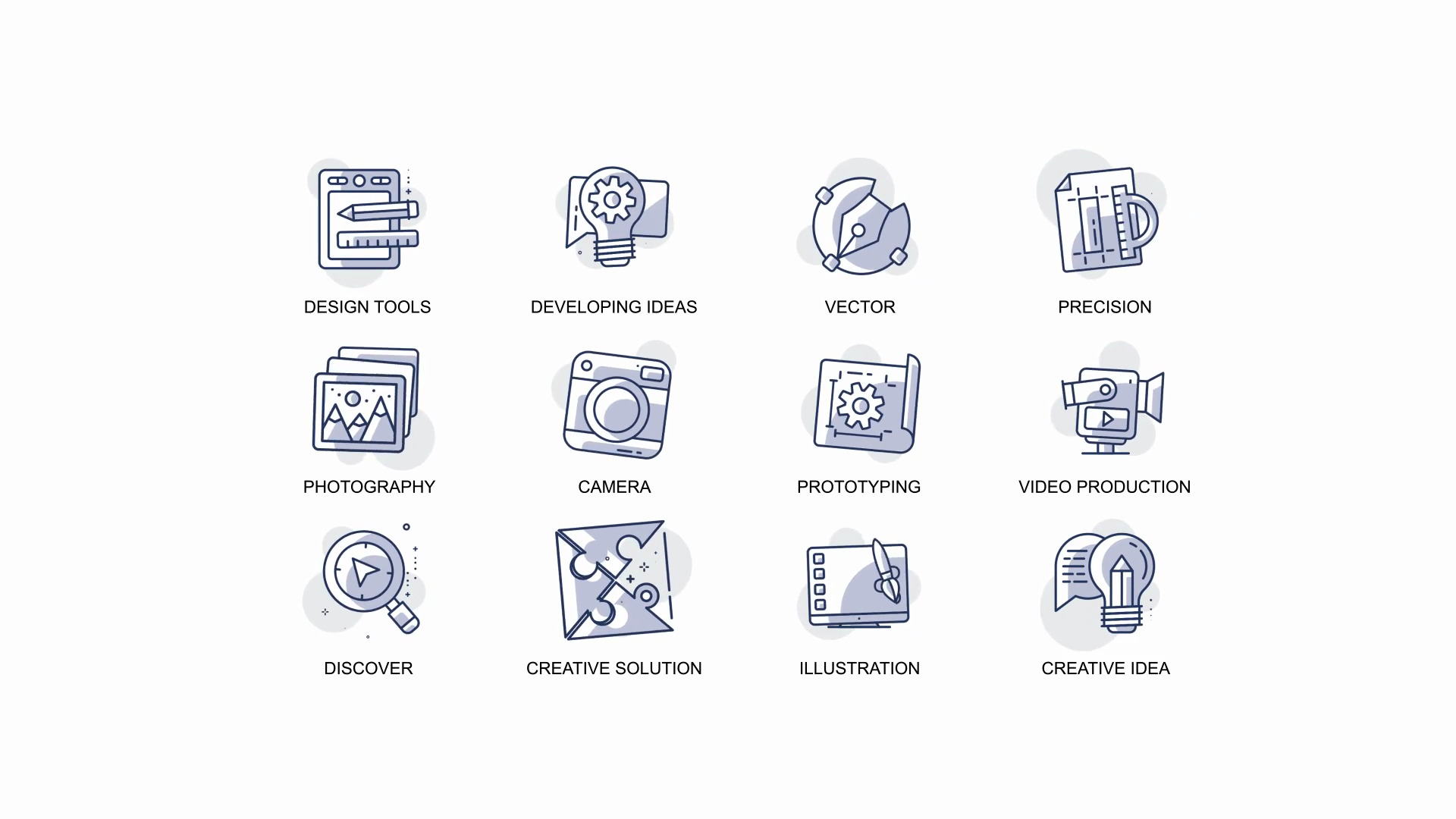 A set of Bodymovin-optimised animated icons with easy customization. Icon design includes video production, illustration, developing ideas and more.