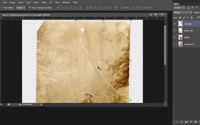 Hi, I'm Marie Gardener, welcome back to archival photo restoration for tuts+. In this lesson, we're gonna look at repairing joins and rips in Photoshop. Old prints get damaged, it's an unfortunate fact of life. They've most likely moved house several times, been stored in dusty attics and been passed around dozens of hands. This can mean they're ripped, sometimes into pieces. But don't despair. It doesn't mean that they're for the bin. Okay, so we've got our document, and you can see that it's kind of pieced together. But it's one layer. So we're gonna need this to be more than one layer, obviously, so it's easier to work on. And we're gonna do that with the magic wand tool. So select the white, and you can see the marching ant lines. It's come over a little bit on the edge, but that's okay, cuz it's just on the ripped edge. It's not actually on the pattern, so that's fine. And then we're gonna go to Refine Edge. And you can see that in kind of a mask there with the overlay. And then we wanna feather the edge a little bit. You can kind of see it's over that ripped bit there but that's fine. You don't really need to have it smooth. You can if you want. It doesn't really make any difference at this stage. And shift the edge ever so slightly, just in case you sorta missed a little bit. And then we're gonna output that to the selection. So not much has changed, you can still see that it's kind of selected the bits that we're gonna select but obviously it's on the white at the minute, so we're gonna go to select and inverse, which is gonna flip up round so now we've got the pieces selected, so if you hit control and j or command and j if you're on a MAC, that's gonna create a new layer. And now if we had the background, you can see we've got a transparent background which is much, much more helpful. So now if you select the last two. And we'll start with this first piece here. Now this is why you shouldn't scan them too close together. Which I obviously have a tiny bit here and there we go, steady hand. All the way around the first piece. And then we're just gonna Control X or Command X, cut that out. Control, Shift, N for new layer or Command, Shift N. And paste that in. So you can see that's a separate layer now. Now I'm gonna call this something sensible like Top Left, because it's the top left piece. And then we'll just hide that again and then we're going to do exactly the same thing with the middle layer again. Slightly steady hand required. It's like the game operation you gotta go around without touching it. And then again I'm gonna cut that out. Paste it on a new layer, and then we're gonna call that layer Middle. And then obviously we're left with the final layer, which is fine. So we're gonna call that. [LAUGH] I just realized I called that Top Left instead of Top Right. Well, that was a good start, wasn't it? So there you go. You can see now that we've got all three pieces separately, which is gonna make things much, much easier to work from. So if we zoom in. Let me just make this a little bit bigger, okay. So we're gonna start to try and line these up. So obviously, they might not be quite the same orientation, but we'll talk a lot in a second, they can be slightly off. But you're gonna look for major things to line up. So in the case with this piece, you can see you've got kind of the definite lines of the tree here. So that's what you wanna try and match up. Now don't worry if there's a bit of a gap, that's fine, obviously we're gonna tackle that later. But you can see that looks like it's right here. There's a little piece missing from the top, which there always was, that's fine. And if you look at the bottom here it's ever so slightly out of line, so we're just gonna turn that around just a little bit so that these border edges match up here. And then. Okay, that looks about right to me. So then we're just gonna go ahead and tick to apply the changes. And then we'll do the same with the bottom left. So you may need to you can see shift these around a little bit so that that sits over the top of the middle piece. And this one's quite off, so again we're just gonna line up the outer edge but then we've got a very definite line here, across the bridge, which makes things a lot easier. If you can see any kind of definite geometric lines, that's gonna make your job a lot easier. If we just move that across. Okay that's not, too bad. It's not perfect, but it's not too bad. And then again it's just not quite right, but we can fix that, okay. So you can see those lines match up, these lines match up, we're just gonna go ahead and tick okay on that. Okay, so. There's the picture there. You can still see the rips, obviously, but that's much better than it was, so we're gonna work in a non-destructive way to repair these. So, you're gonna wanna go ahead and create a new layer, and we're gonna call this, Repair Rips, because that's what we're doing. And we're gonna start with the Clone Stamp Tool, cuz that tends to be the easiest way to fix things like this especially if the background is kind of patterned, but not to the point where it would be obvious if you made a mistake. So at the top you wanna sample all layers because obviously if you don't its only going to take from one side. If we just zoom in here. We're gonna leave that rip there for later on but we can just start from here where you've got the pattern of the trees, that makes it ever so slightly easier. Now you Alt click where you want it to take the source information from and then if I hover over here, you can see that Photoshop in the later editions, this is CS6, has got, like a little preview basically of what you're gonna drag over. So we're using a quite hard brush. I'm gonna make it slightly softer, just so that's not too obvious. Cuz again this is quite patterned and it's not so obvious to be able to tell If you do something wrong. That might be different when you get to the tree. But, yeah. Just keep going over ea