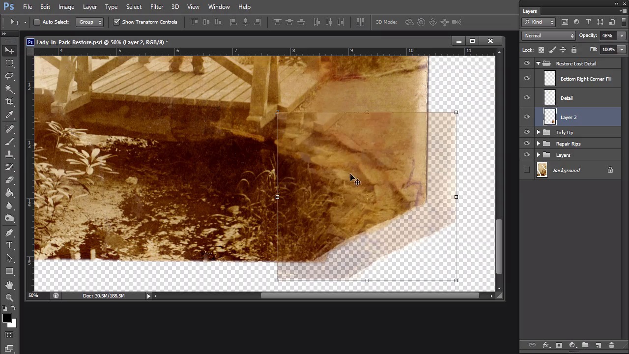 Hi, I'm Marie Gardener for tuts+ and this is archival photo restoration. This lesson is all about bringing back lost detail in your image. Sometimes parts of a face or building will be missing and it will be obvious to us on looking what they should be like. In that case, we can go ahead and patch that up If there was something missing from the shot because the highlights were blown out. Even if we knew what that element was, we still shouldn't really add it. We're trying to bring the original back, not improve on it. Okay, so you'll see that as we've done in the previous lessons. I've created a new group, and this one I've called Restore Lost Detail. Cuz that's what we're gonna be doing. And within that I've created a new layer, which we're gonna be working on, as always, in a non-destructive way. So that we don't twitch our original document. Okay, so if you've got detail missing in a photograph then we've kind of discussed what you can do. You can paint it in. Take a leaf if you've got a graphics tablet. But sometimes there's a simple way if it's not too much detail. So for example we've got this little hole here, which was entirely missing from the photograph. Now, there's a nifty little tool that the later versions of Photoshop have within Content Aware, and that's the Patch tool. So it's like the patch tool and then you draw around the area that you want to patch up. So we draw around our hole. Now much like the spot healing tool. You need to leave a little bit of an edge around the gap so it can sample from that as well and blend it a little bit better. And then you'll see there's a arrow to the right when we hover over that. So if you left click on it and drag it in a particular direction and still hold the mouse button. You'll see that it shows you what it's gonna replace it with. Now it won't be a hard edge like that it will blend it as well. But what I'm gonna try and do, and I'm gonna try and match up our tree and then I'm gonna let go. And then, you can see it's done a pretty good job. It's matched the tree quite well. There's a little bit of unusual detail here, which we can just clean up with the spot healing tool. And then we can just go ahead and fix up to that edge with the spot healing tool as well. So you can see the patch tool made a really big difference. And, it was very little effort, which is always a good thing. Now, this bottom corner which is missing is a little trickier. Because obviously you've got the detail of the park wall here coming into the pond. Now sometimes, you can use the content to where fill to select the missing corner, and put that in. But because it's so close to the edge, and because it's a very specific detail. That's just not going to work. So what we're gonna do, I'm gonna have a new layer again. We're gonna call this Bottom Right Corner Fill. Just so we're not working on the patch that we did before. And then. I'm going to go into the middle layer cuz that's the part what it was here. And I'm just gonna draw around this. And then paste it into a new layer, which I'm gonna put into our restore list detail. So I'll just hide that again. Okay, so you can see that we've basically just copied a chunk of this and shifted it to a new layer. So, because we can assume the wall goes around. I'm just gonna lower the opacity slightly. So you can see through this, there we go. We can assume the wall goes around into this corner. So we can use the existing piece of wall if we move it around a little. To try and recreate the thing that's missing. Obviously, we're gonna have to do a little blending a little warping here, as well. So what we can start to do now is just. Again, quite a low opacity and a soft eraser. And we're just gonna get rid of these corners, particularly the bits we don't need. Cuz we know that this detail's already here. So we don't need that. Okay, and again I'm just gonna lower the opacity of the layer itself. So that we can see where we are. So we need it to come around here to fill the detail. We don't need this bit at the bottom, because that goes beyond our border. As does down here. Now, we are gonna obviously crop the border later, so don't worry too much about the edges hanging over. And you can see it's brought a bit of the, oops, the past detail back there. But we can fix that, it's not a problem. Okay so, if that didn't look quite right and it's, it's not bad really. But what we could do if we needed to shift that a little more, to look more natural is we could right-click and go to free transform. Right-click again, and then Warp. And then what you would be able to do is just bring that round to the right shape. But actually, we don't really need to, that's pretty good. What I am gonna do, is just get the eraser again. And just blend out a little more around here. And then we're also gonna fix this little spot from using the original there and as I say, you are gonna crop out these edges. So you don't need to worry to much about them. And all the whole point of the course as I keep stressing, is to restore and not add. And I do seem to be going against that by adding a bit of wall. But, and yes I am gonna make excuses here. It's not too bad. We know the warp did continue round, well, we can have a pretty good guess that it did. And also, it just saves us having to crop off and lose our whole bottom section of the photograph, which would lose some of the pond and the plants. Which would be a shame. So we don't want to do that. So we're just gonna blend that in, and yeah, pretend that it didn't contradict everything that I've said. So there we go, missing pieces restored and that doesn't look to bad does it? If we just, I'll zoom right in so that you can see the full picture, the bottom corner and this little bit up here. And if I just, I vote not bad at all. As always, save your work. By now, your image should be looking pretty good. Now that we've tackled any loss or damage. It's time to correct or adjust colors and tone
