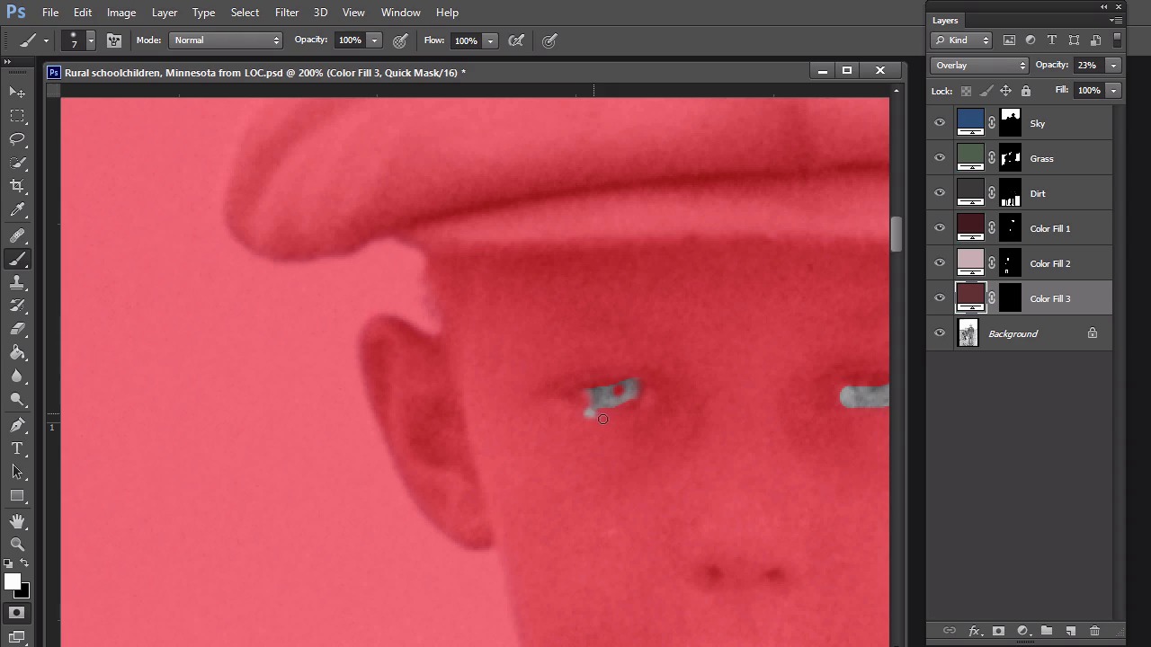 Hi, I'm Marie Gardner for tuts+. Welcome back to archival photo restoration. In this lesson, I'll look at picking good tones for skin, how to color eyes and hair separately, and how to use references, if you're struggling for authenticity. Coloring people and clothes sounds fun, and it is. But if you are trying to be accurate, then you might need to consider things like hair. Would they have dyed it at the time, for example, old clothes, like soldier's uniforms. So for hair, eyes, skin, and clothes, obviously things can be a little bit different because if you strive in for authenticity, then you're gonna want things to look as they should. So we'll start with skin. Because I guess that's the easiest to authenticate, we can see that they're both white children. So we're gonna go for sort of a pinky colored skin. So, what you wanna do is select the skin like you did before using the Quick Selection tool. We'll start with the boy. Once again on the background, And then don't forget things like hands as well. And know that they might be a slightly different color to his face, but it's not going to matter too much. Okay and then because you don't wanna color the eyes obviously and the skin color because that would just look like they were strange alien children, you're gonna hit Q which is gonna change it to quick mask and then click on the brush. And we're just gonna paint over the eyes. Give him creepy, red, alien eyes. So that's just gonna stop any pink from going on to the eye balls. Okay, so then if you press Q again, you'll see that that's selected. And we're gonna add solid color layer like we did before. Now it might seem like, if you're going for skin, go for pink or peachy tones. You want to be really solid with this. You want to go for something really, really faint. And that looks pretty weird but then we change it to overlay or color, see which looks best. Gray color's gonna look best. And then we're just gonna bring the opacity back. Gradually. And I'm just gonna erase a little bit This pleat on his shirt. Okay, that doesn't look too bad, but what I'm gonna do Is just darken this a little. Okay, and the reason for that, is if you look at this close, you can say that they're full of holes. They're obviously a slightly poor or maybe working family. He's probably going to be helping Dad out in the fields. He's probably going to have slightly darker skin than his sister. Those are all kind of things that you want to think about. Now technically, you could could just color in over the girl's face as well. So as I've said they probably got slightly different color skin and the fact that she's a girl as well. As she's got a very fair hair, she's gonna be quite pale. So we're gonna do her separately. So we're gonna do the quick mask again. And let's not forget she's wearing a skirt, we wanna get her legs too And again, don't worry if it's not exact because you know that you can just adjust it when you put the color on. I'm just taking out the dirt here. Okay, that's not too bad, so then once again we're gonna press q for Quick Mask. And we're just gonna brush over, and we're just gonna brush over. Very narrow eyes. And we're gonna carefully brush over the eyes. And then while I'm here, you can see there's a little bit of hair poking over her cheek. So we just want to get rid of that. And a little bit of the sleeve, just there too. Okay and then press Q again, and that's gonna be selected. Adjustment layers are the solid color layer. We'll start with a similar color that we did with the boy. Change that to color. Okay, that doesn't look to bad for her. I think he is a little off, so we're gonna just Change that making a tad Darker and dropping opacity on it a little bit as well. Okay, so that's not too bad. .You can see he's a little more tanned than she is. Now lips, obviously aren't the same color as skin. So we're going to select his lips. And again you can, it's probably easier to do this with quick mask. So I'm just gonna hit. There we go. Hit Q again and then, And then pick the right color [LAUGH] and then just go. Over everywhere apart from his lips. Very thin lips. Okay. We're gonna go for slightly reddy brown color. And we're probably gonna need overlay this time, just to make it a little darker. And then just, ever so slightly, bring the opacity up cuz you don't wanna make it look like he's wearing lipstick. That's not too bad. And then you can try, on the mask, going over her's with the same color. And yeah, that doesn't look so bad so that's okay. That just saves us a little job of that so we're just gonna use the same color on there. Now when it comes to eyes of which you can only really see the boy's, you need to remember to only color in the iris. You don't wanna clear in the white of the eye, or the pupil. So we're gonna zoom right in for this. And. Switch our tool brush. Let's see if we can just see the eye a little bit better. I don't think the mask really helps too much with this, does it? Again, it's something that you can adjust afterwards so it's not too much of a problem. That left him with pretty much no eye here at all so we'll just open up our cloud. The eyes are not gonna be very noticeable on most pictures but in some you might just need a little hint of color. Okay, so let's try that. So you can see our very rough shape of the eye there. And if we go to a solid color layer again, he seems to be a fair-haired, fair-skinned boy, so we're gonna go for Blue eyes. Wow, that looks creepy. And we're barely gonna bring any color in here, just a very slight hint of a color. And then because you can see it went a little over the lid. I'm just gonna brush away any extra color. There we go. Now, his sister probably has the same color of eyes, assuming she's his sister of course. I think we can assume it is. So I'm going to use the same color. And again you can't really see this so it doesn't matter too much with her but just very hint of color. There we go. That's not t