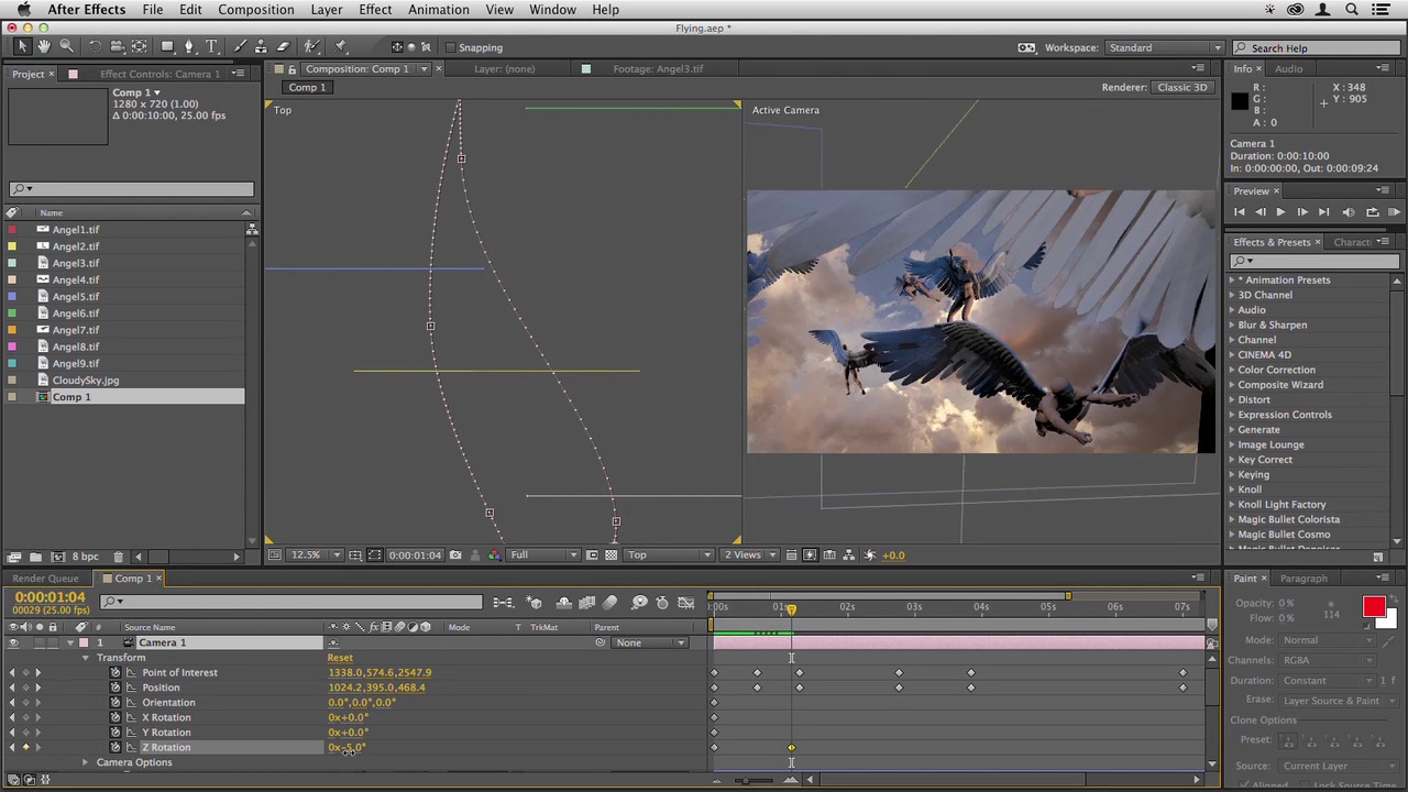 Now that the elements are moving through the scene, let's add rotation and roll to the camera move.