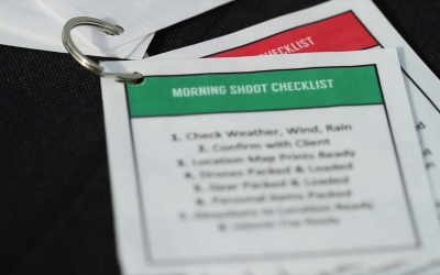 In this lesson, we're gonna go over some pre-flight checklists and how you can properly plan for an upcoming shoot. It's a great idea to have multiple checklists you can run through before every UAV location shoot. I have six different checklists that I run through at different stages when planning and before flying in a scheduled shoot. As they say, the devil's in the details and you wanna be prepared for anything. All the checklists I go over in this lesson will be available as a PDF download, you can print out and use for your own UAV shoots. I'm also a strong believer in keeping a hard copy of all my checklists with me in my UAV case. That way whenever I need it, I have it and I can review it. I printed out six different checklists, I laminated them and placed them on a key ring, so I can easily flip through them. Three of our checklists are advanced preparation checklists and three are day of checklists. I'm gonna go ahead and review them in the order I normally do before a shoot. The first checklist is a location scout checklist. Before filling in a location either for yourself or for a client, it's a good idea to run through all of these procedures. First, confirm the address of the location with your client and go ahead and visit the location in advance if that's possible. I highly recommend doing this, but I understand that it's not always possible. Next, scout the location on Google Maps. So you can go ahead and get a birds eye view of the area and see what's surrounding it. Also check online for a VFR map of the area, that's a visual flight rules or check a UAV safety map like Mapbox and ensure you're not flying in a no-fly zone, and you're more than five miles away from any major airports. Next, go ahead and prevision the shots you're gonna need and the flight areas you're gonna have to be in, in order to get the shots. Identify safe areas to take off and land your UAV at and also look at areas that are best suited to maneuver to in case of a crash landing. Also, you're gonna wanna gain permissions for the property if the client isn't the property owner. Check the weather forecast and see what the weather outlook is for the day of the scheduled shoot. Next is the mission planning checklist. In this checklist, you are gonna review your shoot goals and how you are gonna accomplish them. The first step is scenario or the big picture of what you're wanting to accomplish. So just client goals, the weather for the shoot and the type of terrain that's gonna be shot. The next step is the mission where there's specific goals that you wanna accomplish in the shoot. This is something you can come back to and review should the client have a suggestion or a a change on the day of shooting. The next step is the execution. How are you gonna get the aerial shots? Reviewing your flight paths, shot list, the timing and the safety procedures. Next is Murphy's Law. So think about what can happen at the shoot and what you should be prepared for. Next are the logistics of the shoot, being prepared with proper clothes, food, equipment and in case of emergency. Finally is the command. Reviewing your communication methods when you'll be at the location as well as your role during the shoot, such as being the director, the cinematographer or just the pilot. The next is a drone pack checklist, which is typically gonna take place in the day or night before an actual shoot. The first is the number of UAVs you're gonna be taking with you. Step two is having the UAV batteries charged and packed. Step three is the Controller Batteries are charged and packed. Step four, the controller screens and controllers are packed. Step five, Mobile Devices are charged and packed. Next, check your drone for software updates. Have your camera batteries charged and packed? Electronic cables packed, props and fasteners packed. Have your memory cards formatted and go ahead and pack them. Next to a visual drone inspection, then you go ahead and seal up your drone cases. Next, have your back up items packed such as memory cards or anything else you need to back up? Also, pack an emergency kit. And finally, pack some eye protection. Now let's talk about the three-day of checklist, it should be reviewed the day of an aerial shoot. The first is the morning checklist. These are things that need to be examined early on the day of a plane shoot to ensure that no surprises arise or if the shoot needs to be rescheduled due to problems. First, check the weather forecast for the day, look at the wind speed, the percentage chance of rain. Also, go ahead and check the K index for the day to ensure there is not gonna be any geomagnetic storms occurring. Next, confirm the shoot is still on with the client. Have print out aerial maps of the shoot location ready. Ensure the drones are packed and loaded into the proper vehicle. Next, ensure any other production gear that you're gonna need is packed and also loaded in the proper vehicle. Have your personal items packed and loaded. Have print out directions to the location you're gonna be shooting at ready. You don't just rely on your built-in phone GPS, because you never know you might not have service at that remote location. Finally, make sure your vehicle is trip ready. The next checklist is the pre-flight checklist, which should be reviewed with your drone at the location right before you're about to take flight. First is the latest firmware up to date. Next, do a visual inspection of your drone. Next, install the battery and make sure that it's fully charged, then install the props and lock them into place. Next, check and see if you need a ND Filter or any other filter. Next, insert your memory card into the camera and make sure it's formatted. Next, install any camera batteries if your drone requires them. Next, adjust the brightness on your controller screen, monitor or tablet. Next, are you gonna be standing in the shade? Or do you need a monitor hood for your controller? Next, turn t