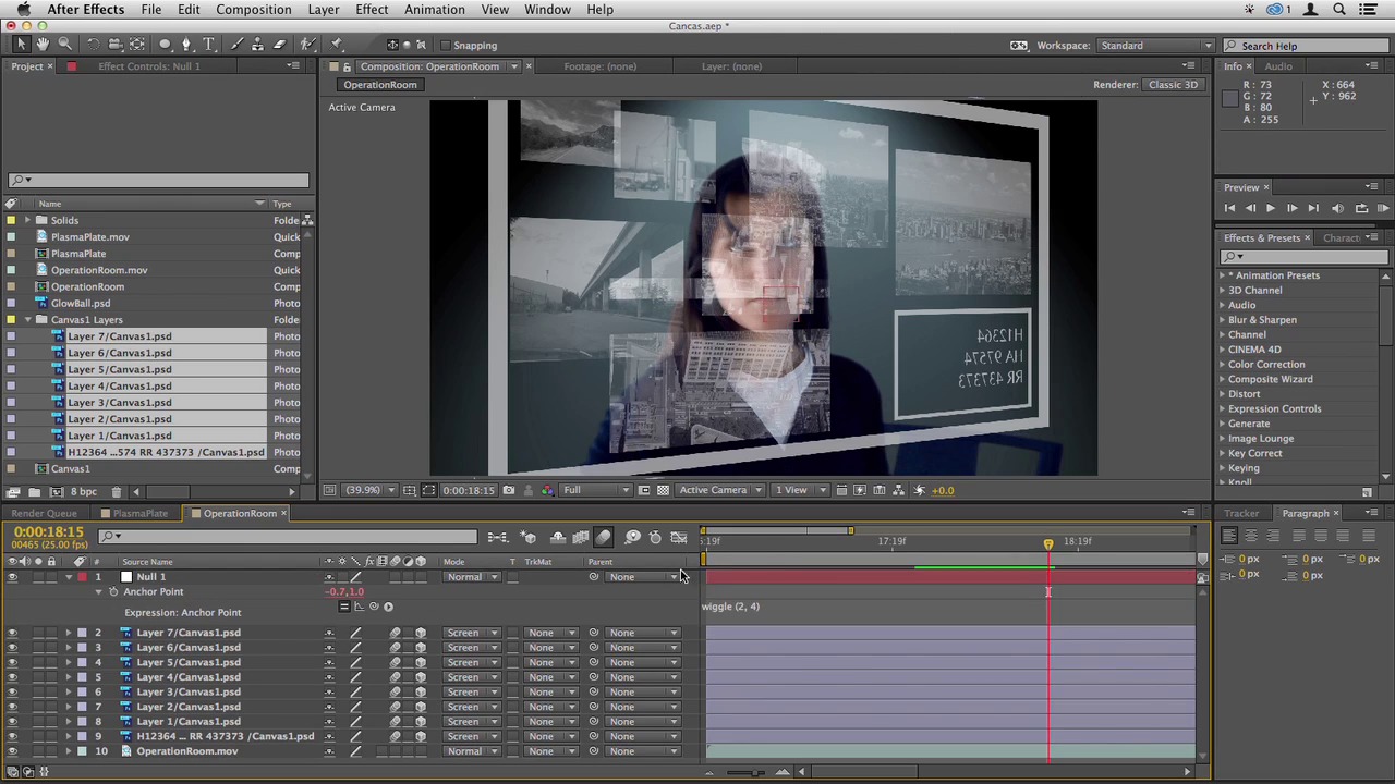 Use a multi-layered file, and control each layer individually, to manually animate a floating holographic display.