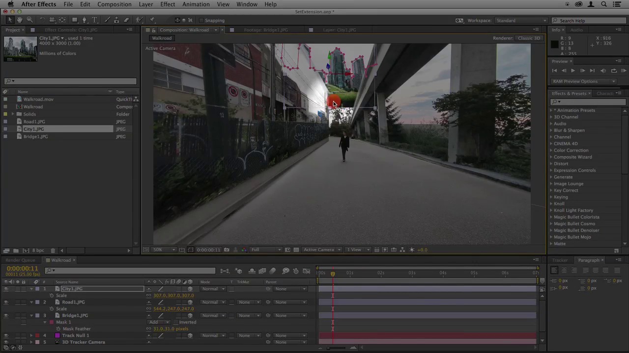 Extending the set on both sides and adding a distant background, then masking out the actor to blend everything into a perfect effect shot.