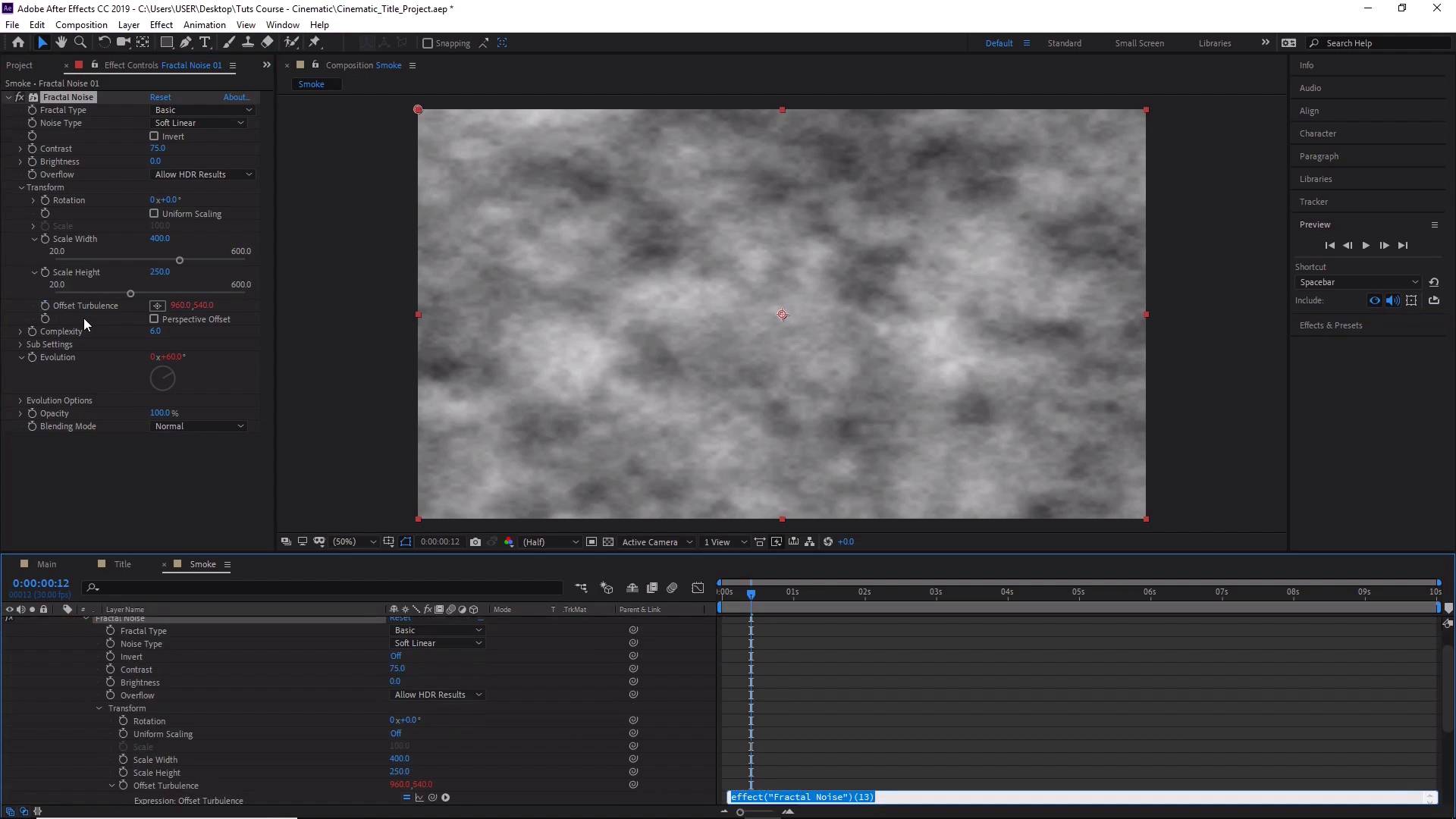 Hi, everyone and welcome back to how to create a cinematic text animation in After Effects. In this lesson, we'll learn how to create, animate and control some nice atmospheric smoke to add some drama and movement in to our project and scene. So let's begin by creating a new composition by going to Composition and New Composition, or Ctrl+N on the keyboard. And let's go ahead and rename this Smoke. Make sure you're happy with the rest of the settings here, and then click Okay. Next, we want to create a new solid layer by going to Layer, New, and Solid. And let's rename this BG for background. And then make sure the color is set to black. And then click Okay. Now we want to duplicate this background, so go to Edit. And go to Duplicate or Ctrl+D on the keyboard. And now we're going to press Enter on the keyboard, and rename this Fractal Noise One. Like so. Now with the fractal noise layer selected, go to Effects. Go to Noise and Grain, and select Fractal Noise, and this will apply a Fractal noise to our fractal noise layer. Now we can start creating our smoke by playing about with the Fractal Noise settings. So let's go ahead and set the contrast to something like 75, just to change the look and intensity of your smoke. So you can actually experiment with this. Like so, and so we're going to set this to 75. And now under Transform, you can scale it up or down to make the smoke appear larger, or smaller, like so. And you can also untick uniform scaling, if we bring that back to 100, untick uniform scaling. And you can change the width, and the height separately now as well. So let's go ahead and change that. So we're going to set the width to 400. And let's set the height to something like 250, like so. Cool, now let's set the evolution to 100. And this is how we're going to animate the clouds. So is we play about with the wheel here like so, you can see how the clouds start to move like so. So let's bring that back to 100. Now, in order to animate the loop, what we need to do is, we need to- Alt+click evolution here. So hold Alt on the keyboards and click on the stopwatch here, like so. And now under here, we're going to change that to time times 150. Oops. Times 150. And this will give us a looping animation for our clouds. Cool, so now if we got to the Preview Panel here and click Play, you'll see a preview of the subtle movement, like so. Excellent. Now in order to animate the direction of the smoke, let's say if we wanted the movement to go from the left side of the screen to the right. We'll need to adjust and animate the offset turbulence. Now, we can find the offset turbulence here. And what we need to do here is we need to create another continuous loop by holding Alt on the keyboard and clicking on stopwatch again. And from here, we want to type in the following, so type in open square brackets, value, open square brackets, zero. Close square brackets, and then we're going to put plus time times 100. Value. Open square brackets one, close square brackets, minus time times 20, close square brackets. And this will make our clouds move from left to right, and subtly move to the top as well. So it gives a sense that the smoke is travelling upwards as well, and we can click on the play button to see what that looks like. Excellent Now if you want these smoke to move even further up, we can change the value here to something bigger like, let's say 70. And now if we click on the play button here, you can see the smoke is travelling upwards in a more vertical direction like so. But let's go ahead and keep it more subtle. So let's change that back to something like 30, so it looks like it's travelling a little bit that way. And we can also change the look and the amount of details our smoke has by playing with the complexity value. So let's go ahead and find the complexity value which is here. And let's change that from six to something like 20. So you can see, if we move the complexity like so, we can change some details of our smoke. So let's change that back to 20. Now what we can do is we can add some opacity to our smoke just to make it a little bit transparent. So let's go ahead and close the effects here. With Fractal Noise selected, press T for opacity and let's bring this down to something like 20%. And this will make our smoke appear lighter and more transparent. Now if you wanted to add some shape to our smoke, we can also create a mask by right-clicking on the layer. Selecting Mask and selecting New Mask. And now we can change the way that our smoke looks. So let's go ahead and move these vertices using our selection tool. I'm just going to make it out that the smoke is travelling from the bottom left of our scene to the top right, like so. Now by doing that, you'll see that our smoke now has this really harsh sharp edge. So, in order to smooth out, let's go ahead and press F to create a feather, and increase the feather like so. Something like 500. And we can increase the bottom here like so. Excellent. Now, all that's left is to preview our smoke by clicking on the preview button. You can see now we have a nice subtle smoke effect which is travelling from the bottom left of the screen to the top right. Excellent, so there we have it, how to create some nice atmospheric smoke for our scene. In the next lesson, we'll learn how to create some final touches by creating a quick zoom animation. See you all there.