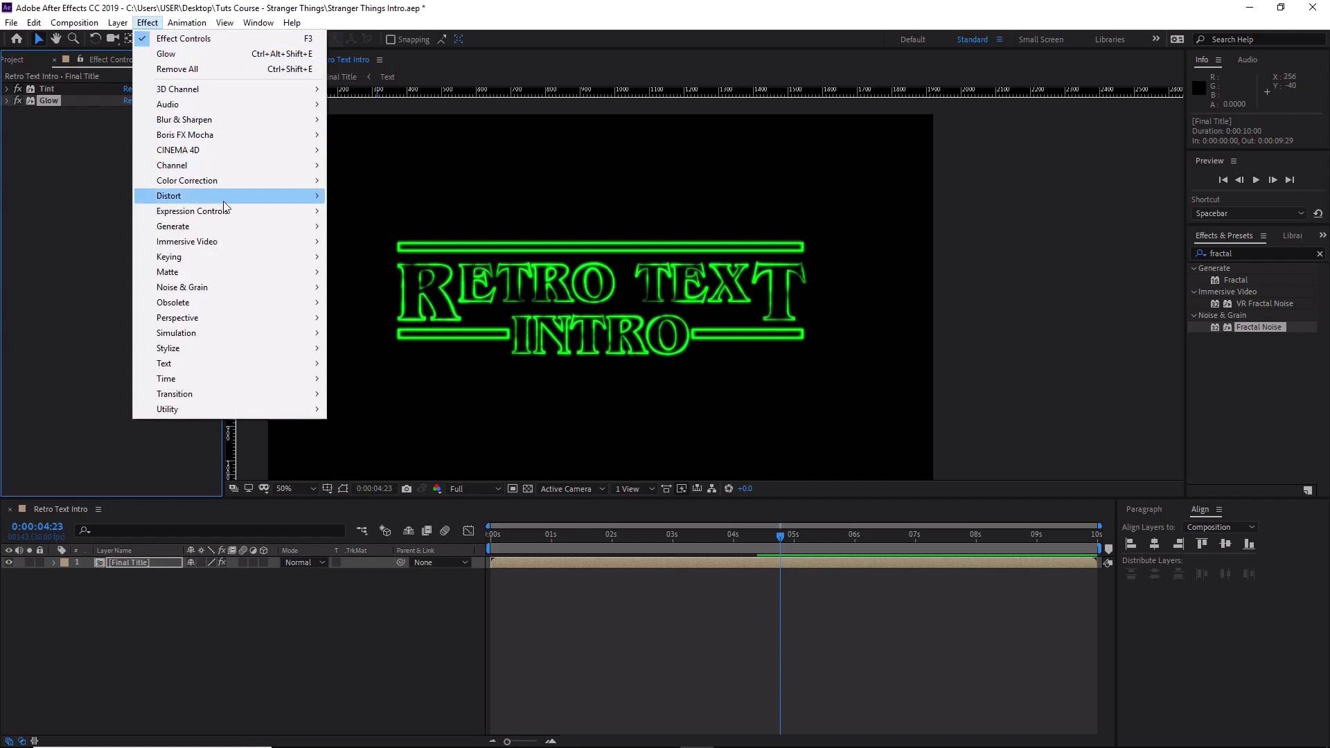 Hi, everyone, and welcome back to the Stranger Things 80s intro course. In this lesson we'll how to add color and glow effects to our animation. Cool, so now that we have the lines and the fractal noise applied, let's go ahead and select all the layers in this composition. So select the top there, press and hold Shift on the keyboard, and select the bottom there. Let's go ahead and right-click, and now let's select Pre-compose. Let's name this composition Final Title. Move all attributes into the new composition and then click OK. This will create a new composition for us to work in, containing our previous noise compositions. So inside the Final Title here, you'll see that we've got everything inside, like so, excellent. Now with the noise composition selected, let's go ahead, with this Final Title composition selected, let's go ahead and select Effect. And we want to select Color Correction. And now let's go ahead and select Tint, like so. Now, this will apply the tint effect to the composition. Now let's go to the Effects and Controls panel here. And at the top here, we want to change the Map White to the color that you want for the title. In this case, we want some sort of spooky green color, so click on that, and let's select this spooky green color. And you'll see, straight away, this is applying onto our text, like so. Now if I move to four seconds, you'll see how this is affecting our full title, cool. Next, we want to add a glow effect to this title, so let's do that. Go to Effect > Stylize. And from here we want to select Glow. And this will automatically add a glow effect to this composition. And in the Glow options at the top here, we want to set the glow threshold to 30. And then we want to set the glow radius from 10 to about, let's say 5. And in fact, I think let's keep it at 10 for now, so let's keep that glow radius at 10. And let's make the glow intensity, and move it from 1 to let's say 0.7. And you can play about with these controls to see the type of look that you want. So I'm going to leave that at 0.7 for now. And for the colors we want to give it a slightly colder effect. So let's go ahead and choose some blue. So let's make Color A a sort of light blue here, like so. And then for Color B, we want to give it a slightly darker shade of blue, like so. Cool, now you'll see that as we add more of these effects into the layer, the panel starts to get a little bit messy and a little bit overwhelming. So let's go ahead and collapse both the Tint and the Glow for now. And then once we're finished with them, and now let's go ahead and add another glow effect. So again, go to Effect > Stylize > Glow. And this time we want to change the threshold from 60% to 25, and the glow radius from 10 to 200. And let's put the intensity to 0.5. Let's put it slightly, 0.1 for now. And again, just feel free to choose the type of values that you want, and play about with these to get the look that you want. And just as what we did previously, we can change the colors here. So let's change this to a cool color, and again, here to a dark color. Excellent, Now let's go ahead and collapse both Glows. And next we want to go to Color Correction. So let's go to Effect > Color Correction. And now let's go to Hue and Saturation. And here you can play about with the saturation and lightness options to get a look that you like. So let's go ahead and bring the colors, let's go ahead and play about with these hues here. So you can see, by playing about with the wheel here, you can change the color slightly. So let's keep it at a colder green. And if we change the saturation here, we can bring the colors out a little bit more, like so. And from there, once you've finished playing with that, we can now go to Effect > Noise & Grain. And now let's go ahead and select Add Grain, cool. Now change the viewing mode from Preview to Final Output. And then we can experiment with the intensity of the grain here as well. So usually a value between 1 and 1.5 looks good, so let's keep it at 1 for now. And next, let's go ahead and collapse the Hue and Saturation and Add Grain. And now next let's go ahead and go to Effects > Blur & Sharpen > Sharpen. And from here we can put a value of 5, like so, cool. Now, the next thing we want to do, we can continue to add more and more effects to this. So let's add a color correction here. So let's go to Effects and go to Color Correction. And let's go to Exposure. And over here, let's change the exposure to, let's say, 0.3 or 0.1, like so. Let's change the gamma from 1 to, let's bring this down a little bit, so let's say 0.7 or 0.8. Let's keep that at 1 for now. Cool. Excellent, now let's go ahead and click on the Play Preview button and see how it looks. Awesome, so that's it for this lesson. In the next lesson, we'll learn how to add a camera to the scene. See you all there.