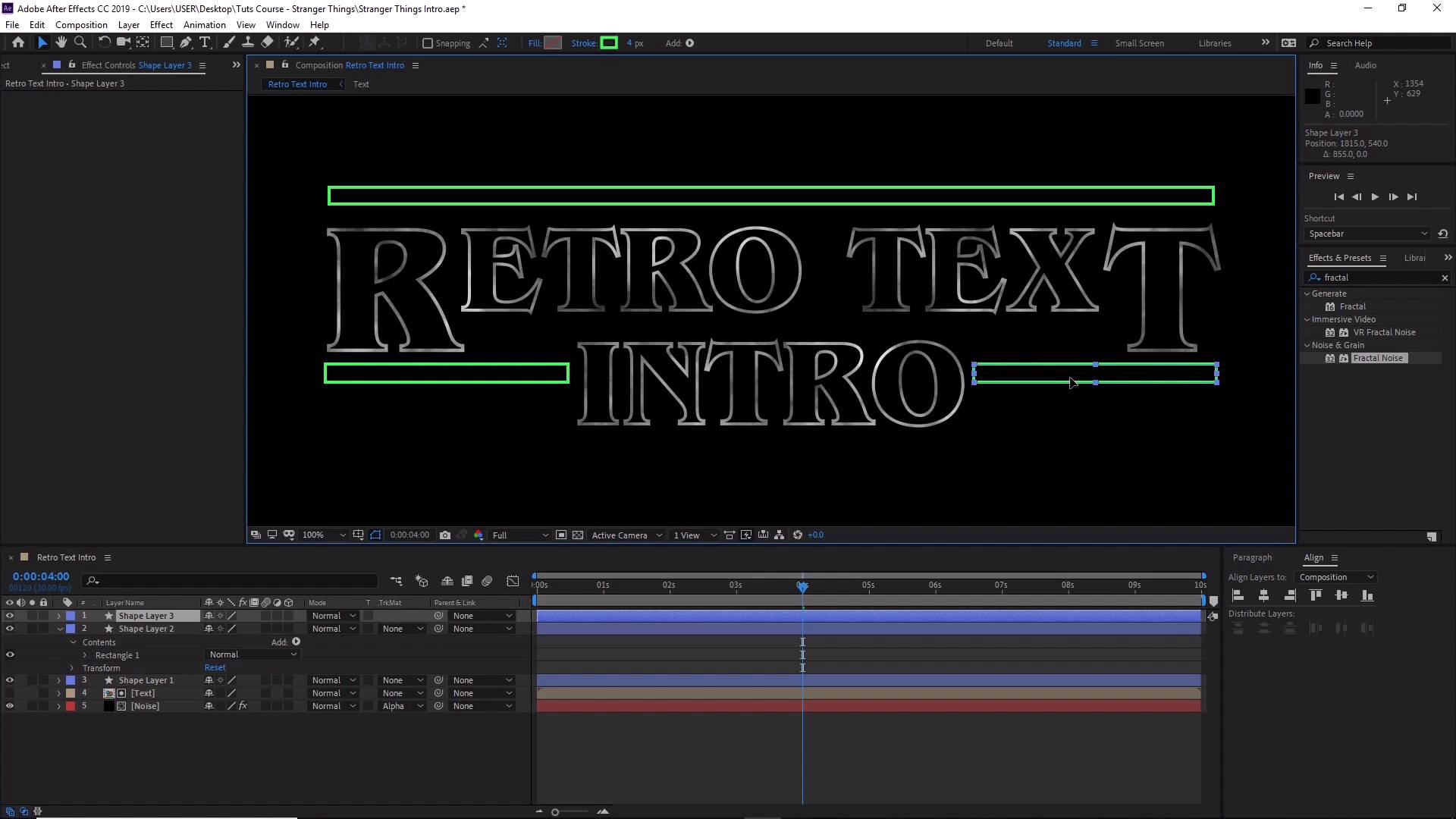 Hi everyone, and welcome back to the Stranger Things, 80's Intro Course. In this lesson, we'll learn how to add Fractal noise to our video. So now that we have our text animated, the next things we want to do is to start adding some special effects to the title, to give it that extra spooky feel. So first, let's change all of our text layers into 3D layers. Now to do this, we want to make sure that's this pane here, the expand or collapse layer switcher's pane, is expanded. So I just go ahead and click on that little button here on the bottom right. And you'll see this will make all these options here available to us. And we want to go ahead and select all three of these layers here. So select the first layer, press shift on the keyboard and then select the bottom layer here. And then we want to select the 3D layer here. So click on this cube here to make all three of our layers 3D, like so. And now next, we want to pre-compose these layers. So right click on this, select Pre-compose, and let's go ahead and name this layer text. Make sure move all attributes into the new composition is selected, and then click OK. Excellent. Now this will create a new composition called text, which is now inside our retro text intro composition. And we can access this this text composition by double clicking, like so. And now, you'll see all three of our layers are inside here. Cool. Now. let's go ahead and create a new solid by going to Layer at the top here. Select New, and now select Solid. And we want to make a black solid. So make sure that the color is selected as pure black, like so. And let's make this name as Noise, and now click OK. Cool. Now, make sure that the Noise layer is selected. And now we want to add an effect to it. So let's go to Effect, go to Noise & Grain, And select Fractal Noise. And now this will automatically apply the Fractal Noise effect to this layer. Now, you can also search for the Fractal Noise in the Effects panel. So just go to the Effects and Presets panel here, and you'll see I've already searched for Fractal Noise here. But if you go to the search toolbar here, and type in fractal, you'll see we can now choose the Fractal Noise effect. Click and drag it onto our Noise layer, like so. And inside this Effects controls panel here, you'll see we've now applied two Fractal Noise layers, two Fractal Noise effects, to this layer. Excellent. So, we only need one of these. So let's go ahead and select the duplicate and press Delete on the keyboard. Now, let's go ahead and drag this Noise layer at the bottom of our layer, like so, so that the text is above our Fractal Noise. And now, we want to make sure that n the track matt here, we select the drop down box from none to Alpha Matt text. Cool. And now, you'll see that our Fractal Noise is appearing inside our texts. Now remember, if you don't have the track matts options available here, just go to the bottom right of the screen here and make sure that the Transfer Controls pane is expanded, like so. Excellent. Now, let's go ahead and start adjusting some of these Fractal Noise settings to get the look that we want. So I want to, let's go ahead and move the timeline to four seconds so that we can see all of our text here like so. Select the noise layer, so we bring up our Fractal Noise options in the Effects Controls pane. And now over here, let's go ahead and start adjusting some of these. So in the panel here, in the Effects, we want to change the Fractal type from Basic to Dynamic, like so. And let's go ahead and change the Complexity from 6 to 10. And now, with the evolutions here, you can turn the wheel here, and this would change the look of the Fractal Noise. So if we zoom in to our text here, you'll be able to see a little bit clearer how subtle the dark areas and the light areas of our line's appearing. Cool. Now, we can go ahead and play with this option later on as well. ButfFirst, let's go ahead and add the boxes to our title. So let's go ahead and zoom out again. Now to do this, we want to select the Rectangle tool here. Now before we draw the rectangle, we want to make sure that we've clicked out of our Noise layer. Otherwise, you'll simply creates a mask, like so. So let's press Control and Z to undo that. And let's click out of our mask layer, like so. And now using the Rectangle tool, let's go ahead and click and drag out a thin rectangular shape, like so. So one for the top. And we want to make sure that the Fill is set to No Fill Here. And we want to set the Stroke Color, and I'm going to set the color to whatever we want. Now in this case, we want the text to have this sort of spooky green color. So let's choose a nice spooky green color, like so. And we want to make the stroke about the same thickness as our text, so four pixels is enough. And next, we want to make sure that this rectangular shape is aligned into the middle. So using this Alignment panel. So let's go ahead and let's find the Alignment panel. So go to Windows and click on Align. You'll see now, that we've got an Alignment panel here, and we want to make sure that we want to align the layers to the composition, and then simply click on Align Horizontally, like so. And you'll see that it was very small and subtle, but it snaps into the middle of the composition. If I go ahead and move it again so you can see more clearly. If I click on to the Align Horizontally button here again, it moves it to the middle. Cool. Now, let's go ahead and draw the other two boxes. So you want one box down here. So that's again, just click out of our shape layer here, select the Rectangle tool. And we want to create one rectangle here, like so. And let's go ahead and duplicate this. So we can press Control D to duplicate. And let's move that to the other end, like so. Cool. And now, we can go make sure that these are all in alignment by making our rulers show again. So just go to View, and Show Rulers. And let's go ahead a drag a ruler out here like so. And you'l