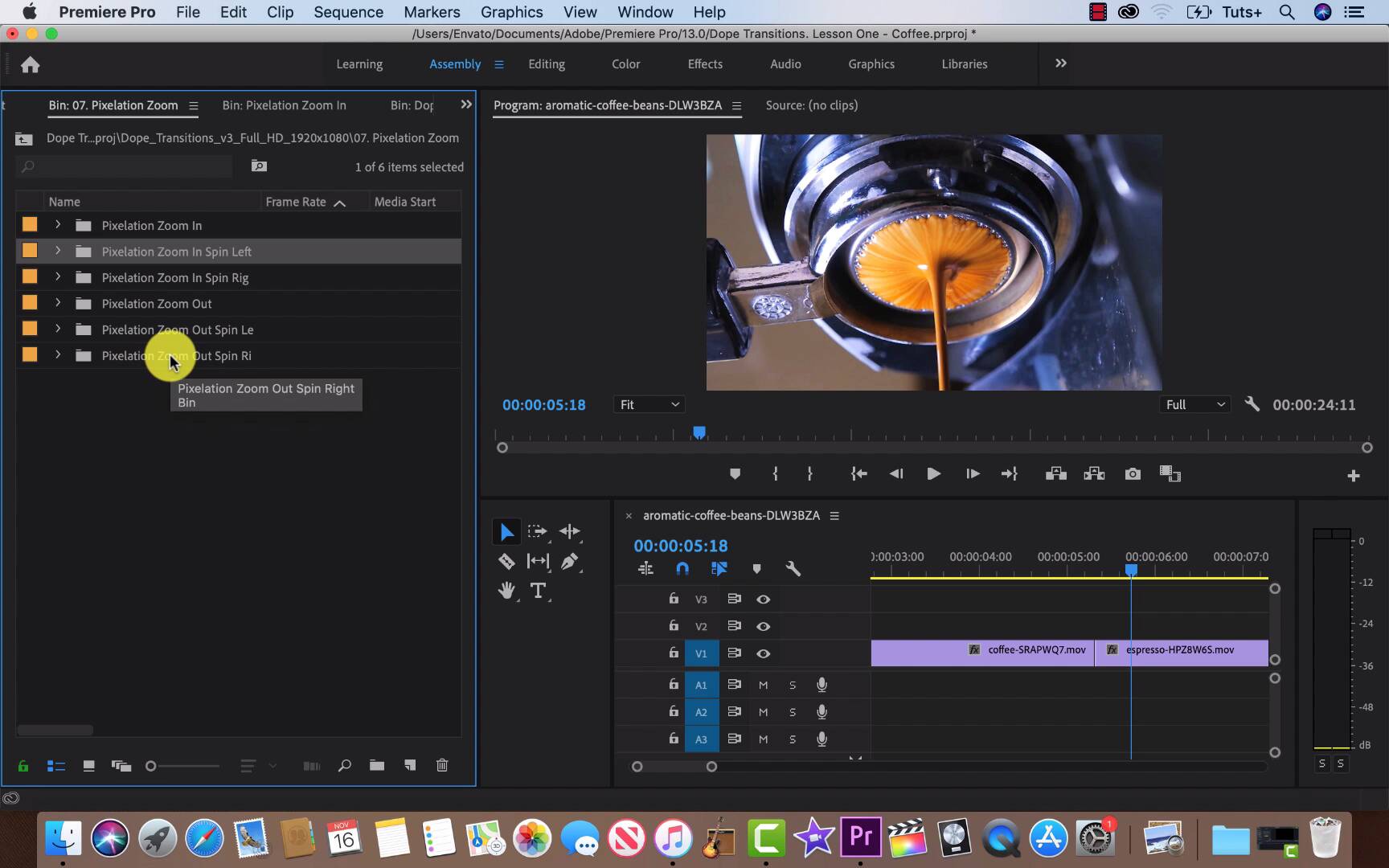 [MUSIC] All right, so we are in Premier Pro, we have our clips in our timeline and dope transitions loaded up into our NLE. So we have three clips which need two transitions, let's take a look. So we have these coffee beans moving to the right hand side in slow motion, followed by an espresso that's kinda static being pulled. And then finally, a latte being made with the milk going counterclockwise. So our motions are right, static and to the left. So let's go into dope transitions and see what we could use. So one of the most important things to keep in mind when using transitions of any kind is that you want them to be seamless. You don't want them to take your audience out of your project and so using something like an RGB split, in this case when the footage is really smooth and kind of classic looking with any of the VHS effect wouldn't mash up really nicely, but let's check, check it out and see what it would look like. So RGB, we're gonna go to the right, and we're gonna check out the slow version. I just generally like the slows. Each one comes with four variations. So it's regular speed times two times four, and a slow version. [SOUND] See, there we go. It's not too noticeable, but it's definitely there. So this time around, we're gonna try it without the RGB split. So we're just gonna back into dope transitions. Select flat Right, and dry over the slow version on top of our clips, making sure that they line up nicely in one straight line down from one scene to another. All right, I didn't mind that at all. That being said, the difference is very subtle. And if the original clips had an effect on it that split the RGB, giving it that old VHS retro look, then I would definitely think about using the RGB files for each one. But now let's go back and try something else. So we wanna go back and close these just keep things nice and clean. Right click close panel right click close panel, and let's check out panoramic. I generally really enjoy panoramic effects. They're nice and simple and give a nice sweet move to them. So we're gonna go right because of the movement. Right, slow because I didn't enjoy them and let's take a nice look. More importantly than enjoying a slow transition the clip I'm using are slow moving, they're not that exciting. And using something regular speed or times to the speed or times for the speed even would just be able to place and not conducive to what I'm working on. All right, so moving forward, let's close this up and close these panels, closing the panels, closing the panels and for the next transition, I think that we're gonna try it's gonna be the pixellated zoom with the RGB split. Not because I think it's the right one, but just because I think it's worth checking it out and showing the variations of transitions this template pack has to offer. It's sometimes hard to see what you're getting in the preview. And I'd always recommend just dragging it onto your timeline giving it a quick peek. And so you just have a better idea of what you're working with. And it's such an easy thing just by pressing Command Zed or z depending where you are to get just to get rid of it. All right, so let's go back and take a closer look. So you can see there's that pixelated RGB kind of image, and definitely not what we need but still a pretty cool effect. Okay, so let's start this over again with a pixellated zoom without the RGB split. And maybe it's been to it just to see what's up. I'm generally thinking that we're gonna go with zoom in or zoom out just because it seems fitting but you never know. Okay, so you'll notice that I selected a spin to the left when the the footage is actually spin to the right and we're gonna see that clash that comes up with it. Okay, so there it is. Let's check it out again. And this is kind of why this is important to keep movement going in the same direction. [SOUND] Okay, but I did like the effect though. That's kind of cool though, so let's go back pixellated zoom. Spin to the right this time slow dragging it over. Wrong place. Let's start that over again and perfect. Okay, let's check it out. Nice, that's a lot better and a lot more fitting for this. So with the previous example. Of the footage going one way and the template going the other. That's a common problem that happens when we don't take care or consideration of our work and we're just using templates to cover up and make things flashier for whatever reason. Now, it's important to take into consideration when using effects and templates, or cuts of any kind is why are we using them? And do they serve the story? And do they serve that the project or the idea. And of course it didn't really serve the project. It was just kind of disorienting and carelessly thrown on. I really think a panoramic would work with this. So let's go into it and grab one up and throw it onto here, throw it onto the timeline and see what that accomplishes. So panoramic to the right and of course again, slow, And there we go. [SOUND] Sweet I really like that. All right, so for this last transition we are going from a pretty static image with a close up. So two close ups and again that latte is spinning counterclockwise to the left. So I think it'd be kind of cool to try a zoom in or zoom out with a left turn to it. So if we go down to the bottom right hand side and click it and drag over a slow transition on top Let's try that again. And one more time, sorry about that. There we go, perfect. Let's see what that looks like. All right, that was kind of glitchy let's try running that back. Okay? So, that was kind of cute and comical, though, I think it's gonna feel kind of out of place with the first transition. So let's see this nice and smooth one coming up, okay? And there's the nice pour, I like that coffee. Okay, so they do kind of compete and clash. So maybe instead of trying to do something more serious, we can try something a little more whimsical. So let's replace this guy over here, delete, d