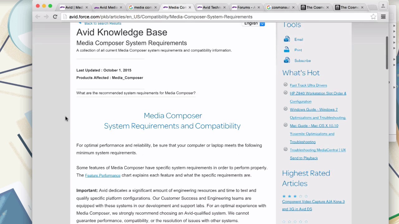 In this lesson, let's go through a couple housekeeping items such as tools, resources, and requirements for this course. You need to have a version of Media Composer installed on your computer. You can either purchase a license or use a free trial. Media Composer offers a free 30 day trial, and it's pretty simple to set up. Below the player, you'll find a button called Source Files. If you click it, it will download a zip file and inside it is the Avid project that we're going to be using. Go ahead and take that folder and drop it into your Avid projects folder. On both PC and Mac, you'll find that under documents and Avid projects. As far as system requirements go, you need at least 8GB of RAM for Avid Media Composer. If you look up Media Composer requirements, you'll find the System Requirements page. This page will give you a breakdown of what exactly you need for your system. For any questions head on over to the avid.com site. You can make your way through the support pages to find the forums, or just go to community.avid.com/forums. You can ask a question here, and it's really a fantastic and helpful community, that's always quick to respond and very professional. As far as footage goes, we're going to be using footage from the cosmonaut. All the footage for this movie is available through archive.org. Look up cosmonaut footage, and you should land on this page. From here, you can select a scene and then download any of the QuickTime movies. We're going to be using footage from scenes S003, S028. All right, let's get started. In the next lesson, we'll start getting familiar with effects.