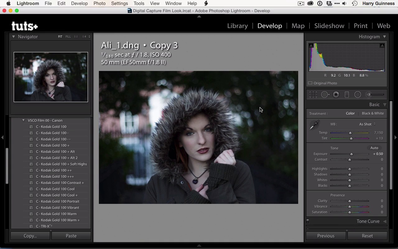 Hi and welcome back, i n the previous movie, we made all these very attractive notes all over this picture. So I had some idea of what I was gonna do. In this movie, we're going to ignore all these notes. I'm gonna bring the picture to a much more neutral exposure down in the image bar there. You can see that I've got this which is the edit with all the notes and then I've got the original file here. I wanna keep the original file so we can compare it to the baseline. So I'm gonna be working from a virtual copy. So I'm gonna right click there and then select Create Virtual Copy. Working with virtual copies is one of the best things about Lightroom. You can easily have multiple versions and multiple edits of the same file and it constitutes very little in the way of extra disc space. So, it's a really great thing to do and it's something I really recommend you do. Every time you're working with an image. Anytime you're making some major changes that you aren't sure about, just use a virtual copy. If you don't like the changes, then you can just go back to the previous version. The first thing to do when editing an image is to bring it to a neutral exposure. As I mentioned in the previous movie, this image is quite under-exposed, so I need to have a look at what data I have in the shadows. To do that, I'm gonna use the sliders in the basics funnel, and I'm going to use the histograph up here to try and get something that's exposed much more to the middle. It's going to look absolutely awful but once we start to edit the image properly and then we'll begin to make it look good. First though we just need to see what we're working with. First thing, I'm just going to work from the exposure slider. I know that I'm going to need to Drag it up a little bit, so let's increase that by half a stop. And we can already start to see the data coming back into the shadows. And because these are blown out, they're bulky, there's not too much texture in there. The big thing I've gotta watch for is just the noise levels. It was shot with ISO 400 for 100, a reasonably moderate camera. So it's something I've got to be too worried about unless I was trying to really brighten it up. I'll show you what I mean, if I brighten it up all the way, now we start to really get some noise into the shadows there. But that's two and a half stops. So I've really got quite a lot of information in this image to work with, a lot more than you´d think I´d have, just by looking at the histogram, or looking at the image as I opened it first. Now, it is heavily scued towards the shadows, a lot of the highlights and whites are in Ali's face, although there's some in the white in the background here, and in the bulky over here. I really want to make sure to keep Ali's face from blowing out, so I'm gonna pull the highlights back. And you can see some fairly ovally texture introduced, but that's not something to worry about yet. And then really pump up the shadows, and get that data back in there and see all the texture we're getting back into the hood here. That's all important, the color in her hair, you can see I've really pulled the shadows up to 87. We're losing our actual black point, but that's not a problem. That's something we can introduce again, at the end of the edit if we want to with just a simple adjustment to contrast. Again, we've sort of lost the white points. I think I'm gonna pull in the whites as well because the brightest values, is it effecting it, no, it's not really effecting it. You can always move a slider up and down the whole way to see what it's really effecting, and that will give you an idea of how much you want to tweak it. I'm gonna pull it down a bit, it's effecting some of the values in her skin, not a huge amount. Now we'll look at the black value, and again, it's effecting deeper shadows. So, I think pulling it up a little bit wouldn't do this any harm as a base exposure. Now it's time to address the color balance, a lot of people like to do the white balance first. I tend to do some of these exposure adjustments and then revisit, the color balance, things like blue can darken your image or at least make your image appear darker so your always going to be tweaking it as you go. Good place to start with is the As Shot especially if your working with In auto mode, you can also have a look at what Lightroom thinks it should be, by clicking on auto. And you can see that Lightroom has pushed that quite a bit to the magenta rather than the green. Let's have a look, plus 20, yeah so it's warmed it up and pushed more magenta into the tint. I don't feel it needs more magenta, but I think it could do with being warmed up a little. So not too much somewhere around there is where I would feel that the white balance is sort of neutral for this scene. All these hair and skin tones are fairly natural and there's nothing to color casting about the image. I can push the backslash key to have a look at the before, and as you can see, we've come a long way here. And this is, well, actually an uglier image and certainly a less visually striking image a far better exposure. This will give us an idea, along with the plan, of what we need to do to the image. In the next movie, I'm gonna do just that, I'm gonna apply the preset and start editing the look and feel of the image so that we can emulate the Kodak gold film.