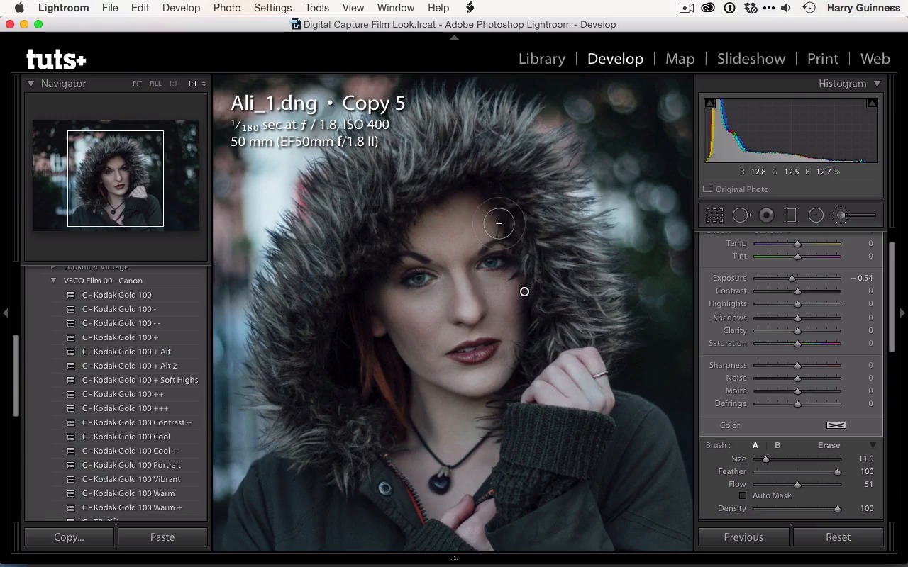 Hi and welcome back. In the previous movie we applied the Kodak Gold 100 preset to this image and tweaked the sliders a little bit to get to this exposure which I'm pretty happy with. So it's now time to do the local adjustments. While I wouldn't actually recommend you create another virtual copy at this point, just so that I've got a step by step guide that we can walk through at the end. I'm gonna create a new virtual copy before applying the local adjustments. First thing you're gonna do is clean up work. So I'm gonna grab the healing tool in Lightroom, which is much improved in recent versions of Lightroom. I'm using Lightroom CC, which is available as Lightroom 6. And it really is on par with some of Photoshop's tools. You still wanna be using Photoshop if you've got any really heavy tidying work to do. But for what it is, it definitely works. We've got this little blemish here. I'm making sure that it is set to Heal so that it is gonna sample and then blend it in, rather than Clone which then just replaces it. So I wanna be using Heal mode. The size I am adjusting is my tablet, but you can also adjust using the slider there. I like to keep it fully feathered, so it's a nice soft blend. The opacity is at 100. We are not trying to diminish anything so much as just fully remove the blemishes. The one problem with doing this for clean up in Lightroom, is that because it's working on a rolefile, it's a little bit slower at processing everything than Photoshop. Photoshop working on the raster image, so it's actually changing the pixel values. Where as, Lightroom is updating a side car file that's telling the computer every time it displays something, to recheck pixels and to change pixels and things. So it's a far more complex series of maps, which is why Photoshop has had these tools for two decades, now the healing tools were a fairly early addition to Photoshop in the 90s but are only becoming part of Lightroom in the past few years. With the healing brush tool, in Lightroom CC you can paint brushstrokes rather than just removing single spots. It's important not to paint too big a brush stroke. It will blend unnaturally, and you can get some fairly ugly effects. You really shouldn't be operating on anything that's too much bigger than a spot or a stray hair or something. The other thing is, the white cursor you're seeing painted there isn't the full brush. That's including all the fettering and the opacity, so don't worry that it looks massive, the actual brush size is significantly smaller. That's just blend area that's being taken into account. I think get rid of that little blemish there. One more on the chin. I'm just moving around the image using the Spacebar to grab the hand and then my Wacom tablet on top to move. I think these are all the little blemishes. The problem with doing this sort of touch up work is the longer you spend zoomed in the more time you'll keep doing this. And you'll eventually end up just retouching pores. I'm gonna zoom out to about there, and then using the little switch toggle there, turn blemishes off and back on. Then you see the changes on the cheek next to her lip. And I think that has tidied up the main distractions. One of my favorite photographer, Chris Orwig talks a lot in his retouching about just reducing and simplifying. You're not trying to create shape perfect beauty portrait, you're just trying to simplify everything so that there are no distractions. And the people focus on the image rather than on the little blemishes or the discolorations and things like that. These are things your eyes miss naturally when you're actually looking at someone, but strangely see in images. Next, I'm going to grab the brush tool. I'm gonna start doing that dodging and burning on Allie's face that I mentioned in the plan. If you can remember that I said I was gonna be burning on the underside of her cheeks here, brightening just above that to increase her cheekbones, then I was gonna be brightening the chin a bit, on the forehead, on the nose, a bit on the lips. I might darken up the neck. I might darken up that hand. That's still a little bit bright. I'm also probably gonna brighten up in here. Possibly a bit of clarity. Maybe even some saturation. I'll see how I go. And keep that focus on the hair. I quite like the flash of orange there. So, I've got the brush tool. I wanna make sure it's mostly feathered. Flow works similar to how it does in Photoshop. When you paint back over an area, it adds in more of the effect. So at the moment, if I paint once it's only applying the effect at 50%. If I stroke back over it again, it applies to the next 50%. I like to work like that which means I don't have to constantly create new brushes to get a slightly stronger effect we want there. An exposure of minus half of step or around minus half a step is fine. Again, I'm just controlling the brush size with my Wacom tablet, but the size slider is there. I want it fully feathered, and I don't want Auto Mask turned on. It tends to get a bit weird, and it's very processor intensive. So I'm just gonna start by burning the undersides of Allie's cheeks here, just paint the brush stroke in like that, and then on the other side here. If you want to learn exactly where I'm painting, you can check out some of the new tutorials on retouching on Tuts+. You can also look at make-up artists, they are the experts of this, and see where they paint when they're contouring. That's really the best thing you can do to learn the best places to be dodging and burning all your images. I'm also just gonna emphasize beside the nose there. And then the end if I do the turn off and turn on, you can see that's just heightening the definition of her cheek bone a little bit. Going to grab a new brush. Click on the New, and then I'm gonna reverse this effect. I want to have a half a step of dodging. If I don't click New, and I move that slider, it's gonna actually change the brush strokes I've already