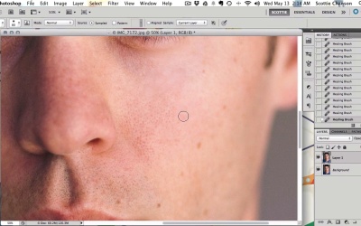 Headshot Photography. In this lesson, we're going to be doing something a little bit different. Instead of a high volume corporate shoot, this is the actors session that we shot in a previous lesson. And so as you can see, we have tons of images of Shane. But the good news is is, that by looking at the images earlier with Shane, we've already picked out our favorites, and we have them marked as blue. So here are the three images that we're going to be working with. Just like last time, the first thing that I like to do with my images, is start off by adding my Bright Grain preset. That just does the same thing. It gives me that consistent look that I can start, with and then I can tweak it from there. So, obviously, I feel like this is a little bit warm, so we're gonna make it a little bit cooler. We're gonna bring the temperature of the white balance down. I think that looks pretty good right there. A little green, so we'll bring it up a little bit redder here, a little more magenta. And it might even be a little bit bright. Let's see. That's, it's just a tiny bit. And I actually think I want it just a little bit cooler than that even. Right there, I think that's just about perfect. In our last lesson at this point, we just selected all of the images and synced to them, and then we were pretty much done. But because each of these photos was taken with slightly different light, we're gonna have to give each one its own attention. But just to start things off, I'm gonna go ahead and select them all, and sync them. Just because they are pretty close to each other. So let's see how close that got us. This one still looks pretty good. But it's not quite ready. So I'm gonna bring it up a little bit. Cuz I think it's a little dark. And I think it can even be a little bit cooler than the other one. And let's bring the shadows in just a little bit, to make it a little more dramatic since it is a theatrical headshot. And right there, I think that's perfect. And now, I'll move on to the next one. This one, the white balance is way off, because we shot this one with a flash, so we have a totally different color of light source, so we're gonna have to warm this one up quite a bit, probably around 5,600. That's perfect, and let's bring the brightness back up. Right there is great. Now I think I want it just a tiny bit warmer. And right there, that's perfect. All right, now all of my images are done. And all we have to do is go ahead and export them. Lets export them, find a Choose it and export. And once again we are just gonna have to sit and wait while Light Room does it's job. For three files it shouldn't take too long, it should be done in just a few minutes. Okay, so once we're done with Llight Room, we can go ahead and minimize that. And then what we wanna do, is go ahead and open up our files into Photoshop, to do the final retouching. For this lesson I'm only gonna do one of them. So we're gonna drag it over here into Photoshop. Go ahead and close that out. All right. So, there we have it. So the very first thing that we wanna do, is we wanna duplicate our layer. By hitting Cmd+J. And this way we can always go back, we can always delete this, and we always have the original sitting down here. Next we wanna go ahead and select the Healing Brush tool, and it's time to get some Retouching done. My theory when it comes to retouching is, I don't like to take away anything that's permanent. I only like to lessen red spots, and any blemishes that are temporary, and are gonna go away in a few days, anyway. So, let's go ahead and zoom in, and start to do some retouching. I like to get pretty close. I use the healing brush in the way that allows me to select the source, and then heal from there. [SOUND]. Here's some red spots here, we just kinda go all over the face. When you hit the space bar, it gives you this hand so you can move things around. And we just wanna go after any red spots, anything that is not permanent. One of the things you want to be careful of at this point is, if you grab from this blurry area right here, and then you try to do some healing of red spots right here, what you'll end up with is a spot where there's no pores, and that doesn't look natural. So we'll undo that. You want to make sure you are sampling from an area that has a very similar texture to the area that you're going to be trying to cover up. So you just kind of keep doing this all over the face, any little red spots. See these here, they look like permanent spots to me, so I'd probably leave those, unless the actor asked me specifically to take them out. But then this one here looks like it's not permanent. We'll just kind of smooth some of this out. And we just kind of keep going, keep going. I like to zoom out every once in awhile, just to kinda get an overall view of it. And make sure I'm not kinda losing the texture of the skin, and I'm not getting too crazy with it. Back in, this spot here needs a little bit bigger. So we'll kinda lessen that a little bit. I feel like we've got some bigger spots up here. So, the next step is to go ahead and do some dodging and burning. And there's a million ways to do this, but the way I like to do it is to create a curves layer. And then I will duplicate that curves layer. We'll call this one Dodge. And we'll call this one Burn. And on the Dodge layer, I'm gonna take my midtones or just above, and go ahead and bring up the brightness. I wanna bring it up to just the point where the highlights kinda start to. Look a little bit crazy. That looks perfect. And then I'm gonna go ahead and fill this with black, so that we don't see it, and then I'll go to my burn layer, and basically do the opposite. I'm gonna go down here towards the shadows, and bring those down just a little bit, till they start to look kind of bad. Almost. Right there. And then once again, the same thing, we're gonna fill this with black so that you can't see it. And now what we're gonna do, is we're gonna be 