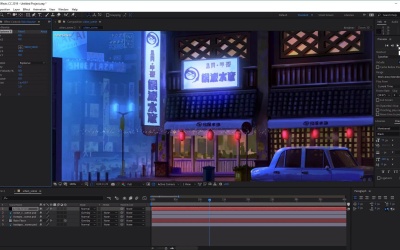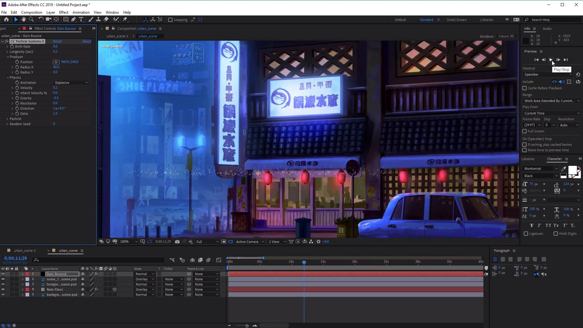 Hi everyone, and welcome back to the urban rain animation course. In this lesson we'll learn how to animate some rain particles bouncing off some hard surfaces, such as the top of the car here and also the top of the rain covers here. So let's start by creating a new solid again. So go to Layer > New > And select Solid. And in the solid settings, let's rename this rain bounce. And here we want to change the color to a pure black like so. Once you're happy with that, go ahead and click OK. Now with the layout still selected, we wants to go to Effect go to Simulation and we want to select CC Particle systems 2. Now free zoom out here and this, zoom out here and move the timeline further along, you'll see that the particles have been added to this layer and what they look like. Now in its default setting, you'll see that it looks like a fountain of yellow lines like so. So in order to change the look of these particles, we need to go to the Effect Controls panel here. And we wanted to go ahead and open up the particle options, which is found here. Now once you've opened this up, the first thing that we want to change is the color of our particles. So let's go ahead and change the birth color from yellow to pure white, like so. And then for the death color, let's go ahead and select the death color here. And we want to change the death color to a sort of grayish blue. So something like B, B, A, C4, like so. And then click OK. Now let's go ahead and change the producer options. So let's go ahead and close this and open up the produce options here. And this is where the particles comes out from. So opening this up, you can see that we can change the radius of the x and the y as well as the position of the producer. So let's go ahead and change the x radius of our producer here. And this will you'll see how this is making the producer look like the particles are coming out from a flat plane or a surface instead of a single point like we had before. So let's go ahead and stretch this out to something like 40. So we can also add a value here just by clicking on the value and inputting it into our keyboard. And from here, let's go ahead and decrease the birth rates. So from here, let's select the birth rate and change it from 4 to something like 0.6, just to reduce the amount of particles shown here. Now once we've done that, the next thing we want to do is play about with the physics options. So let's go ahead and open up the physics options here. And from here, we want to change the gravity. Now you'll see how the particles are sort of moving downwards and we want to create a bounce so the particles need to move Upwards. So let's change the gravity here and move it down. So you'll see how the particles are now slowly moving up, so let's change it to minus 0.5, like so. And now you'll see that particles are moving upwards. And will also change the longevity here from 2 to, let's say 1, like so. Just to reduce the amount of particles and reduce the lifespan of our particles. And this will also help hopefully make the rain bounces look a little bit more realistic just bouncing up from the surface instead of flying up in to the sky. Now from here, we also want to change the velocity. So let's change the velocity from 1 to 0.2. And you'll see now how the particles are getting smaller and smaller. And hopefully they will be able to fit in with our landscape here. And then at this point all it is, is just playing about with the values of the options that we just discussed. So things like the birth rates, and the longevity, just to come up with a look for the bouncing rain that you want that suits your image. So I'm just going to change the birth rate to 0.6, and let's change the longevity all the way down just to reduce the height of our particle bounces changes to 0.2. And let's go back to the producer here. And we wanted to change make sure that our radius in the Y is set to 0, just to make sure that our surface looks as flat as possible, depending on the look of your painting. And then all we need to do here is just click on the Play button to see what our bounces look like. Excellent. So I'm quite liking the look of that. The next thing we want to do from here is we want to apply this in to our painting. So to do this we need to select our rain bounce layer and pre compute by right clicking, and then selecting Precompose. And then we want to just name this rain bounce again. And make sure to select move all attributes into the new composition. Select this and then select OK. Now with this comp, we can use the Select and Rotate tools again, just to move it into place. So let's use the Select Tool. Make sure we've selected the Rain Bounce Composition, and then just move it into place. So let's begin by moving it along the Rain Covers here. I'm just going to use the rotate tool here just to rotate it slightly, so that it fits in with the angle of the cover like so. And once we're happy with that, we want to go ahead and select the pencil here. And we're going to use the pencil to mask out the areas that we don't want it to be shown. Now you can see that we've got an area here to the left and to the right, where the rain bounces are still showing. This doesn't make sense. So let's use the pencil to mask those bits out, Like so. And then once you've done that, all we need to do is go ahead and duplicate this. So press Select the rain bounce composition, press Ctrl+D to duplicate. And then just use the Select tool to move it along to the next cover, like so. And then we can adjust the mask, So that it fits the next roof. And then we can duplicate this again so press Ctrl+D to duplicate. Use the selection tool to bring it to the top of the car here like so. And then again, using the selection tool, we can adjust the mask, like so. So it just covers the top of our car. And we can also do the left and the right of the car as well. So that's press, Ctrl+D again to duplicate your Selection tool, move it along