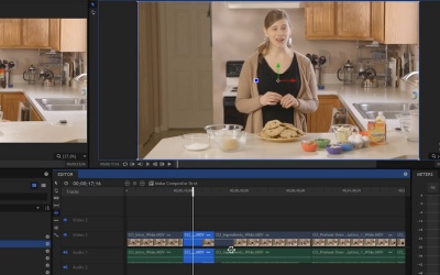 In the previous lesson you learned how to use the ripple edit tool, the selection tool and the trim tool. In this lesson, you're gonna learn how to use the slip tool, the slice tool, the slide tool and more. The slice tool, which is c on the keyboard, this is used to basically create an edit point or you can think of it as slicing a clip. So, let's say for example you had a clip here and you wanted to cut this clip in two, maybe you wanted to take some frames right out of the middle here. Well, hos do you do that? I go back to the selection tool. There is no edit tool that will let me just remove frames from the middle. What I first need to do is create an edit point and I can do that with the slice tool. So I just click in the middle here, that's going to cut this clip into two clips. Or in other words it's going to create an edit point. So now i have a point. If I switch back to the selection tool, now I have a point where I can make an edit. If I just leave this alone and play it. >> Three quarters of a cup of melted butter. >> You notice nothing happens because I can put 100 edit points in here and as long as I don't modify them, nothing will really change. So just because I put an edit point on here doesn't mean anything's going to look different or sound different, but it does give me the opportunity now to go ahead in here and make some kind of edit. So that's gonna be another useful tool that you're going to use again, that's the slice tool which is C on the keyboard. The slip tool, which is y on the keyboard, is used for making a slip edit. So what the edit tool is going to do is it's going to adjust the clips in and the outpoint without adjusting it's position on the timeline. So watch what happens when I click and drag with the slip tool. What you're going to see up in the viewer is the new end point and the new out point. So let's say, for example, I just push this all the way to the left. Down here in the editor it looks like nothing happened, the clip didn't move. It didn't get longer or shorter. What happened was it got a new in and a new out point. Which means the contents inside the bounds of this clip moved. So now when I start this clip >> Ingredients, pre-heat your oven to 325 degrees. >> It's in a different spot. Let me just undo that. Now that wasn't very drastic because there wasn't a lot of space at the end of that clip. But if I come over here to this clip right here, and I do a slip edit here. You're gonna see now, again, it didn't move. It didn't change it's length, but when I play this clip >> Melt chocolate chip cookies. >> You can see that it starts from a completely different spot, so the slip edit changes the in and the out point without moving the clip or adjusting its length. Very very useful tool, I'm gonna undo that. The slide tool is used for making a slide edit. And that's when you want to quickly move the position of a clip on the timeline relative to those before and after it. So let's say, I wanted to move this clip down. I like this clip's duration but I just want to push it down the timeline to the right. If I do that with the selection tool, very easy to do. Let me just click and drag it to the right. But what happens is I have a gap here, and that's not really what I want to do. When I do a slide edit, using the slide tool, it's gonna do a very similar thing, except that there's no gap here. So, I'm moving the clip down and I'm filling in the space behind it with a new out point for this previous clip. And you can see the other clips in the timeline are not affected, they stay in the same position. So with the slide tool, I'm not adjusting anything else except for the clip that comes before this and after this. Everything else remains the same. So I can do the opposite, I can push it up this way. And what will happen is this clip here will get a new end point. And this clip here will get a new out point. It basically fills in the gaps. And it's useful for fine tuning the timing of your clips. [SOUND] I'm just gonna undo those changes. The rolling edit tool, which is right down here, that's E on the keyboard, the roll edit tool is used to trim two continuous clips at the same time. The outpoint of the first clip, and the in point of the second clip will be trimmed simultaneously, changing the duration of both clips without moving their positions in the timeline. So look at these first two clips here, what I want to do is change where this edit point is. And I'm going to do that with the roll edit tool. If I click right here in this edit point and I drag, you can see that the edit point got moved. This first clip here has a new out point. The in point didn't change. We didn't move it on the timeline. It's just shorter, and it has a new outpoint. On this second clip here, I moved this endpoint to the left, which means this clip here got longer. But if you look at both of these clips together, you can see that the duration of both these clips didn't really change. I just moved the out point of this clip and the in point of this clip right here. It doesn't change anything else. It's just basically moving this edit point. So if I push this back, I'm making the second clip longer, giving it a new end point and I'm making the first clip shorter, giving it a new out point. Let me undo that and finally, we have the rate stretch tool. The rate stretch tool is used to increase or decrease the playback speed for specific clips. So let me come down here to the end. I'm gonna grab with the rate stretch tool here. I'm going to click and drag this clip here to the right. Now what I did is I made this clip slower. If you can imagine, I did not change the end and the out point of this clip but you saw that the clip got longer. Now if I didn't change the in point and the out point that means the contents in this clip is the same it's just occupying more space and thus it plays back slower. >> Three quarters of a cup, which is the same as one and a half sticks. >>