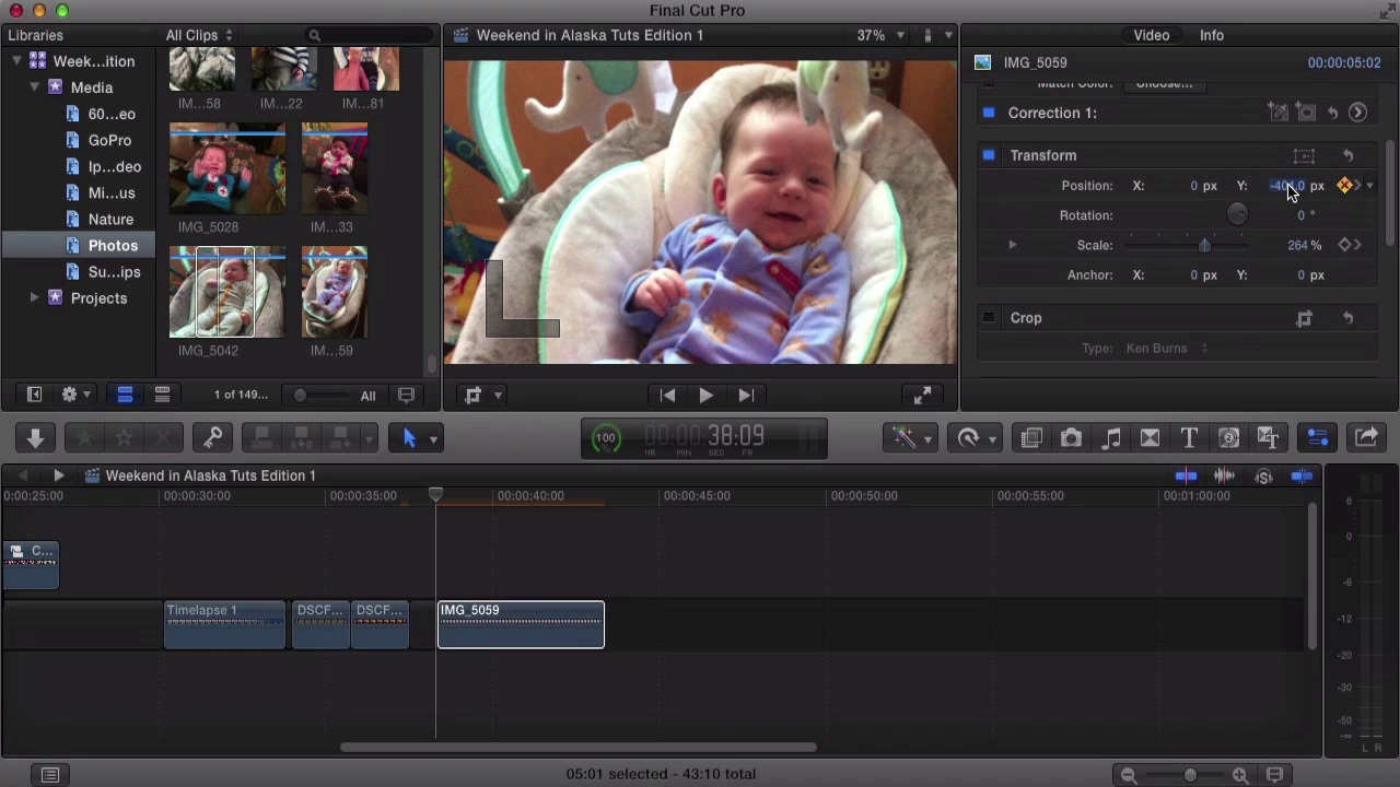 Often our video projects mostly or entirely consist of photos rather than video footage. You’ll learn how to place and trim photos, add a Ken Burns effect, adjust cropping and scale to fit your video resolution, and create simple keyframes to animate photos.