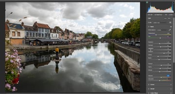 You'll notice some red and blue dots on the photo — they denote where highlights and shadows are clipping, so a loss of information. You can turn clipping warnings on by clicking the two small boxes above the histogram at the top of ACR.