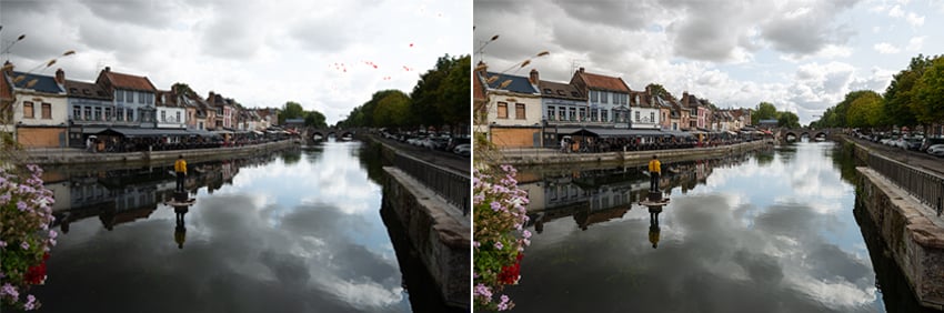 Here's a side by side comparison of the two images. You can see that the exposure is better now, there's detail recovered from both the highlights and shadows. I warmed the image with the Temperature slider and added some contrast and midtone sharpening.
