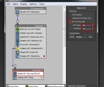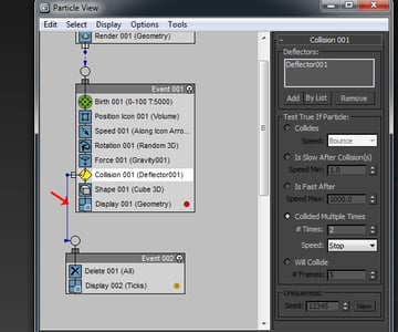 Press 6 to open the Particle View once again. Here make a new event with the Delete and Display operators only. Connect the string of the Collision operator from Event 001 to the Event 002.