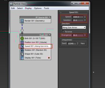 Now with the Speed operator selected, set the values for Speed to 1500, Variation to 20 and Divergence to 50.