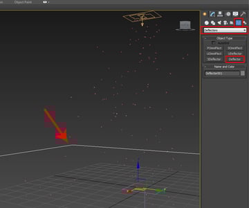 The spark particles should collide with the ground and bounce a bit before dying, so we need to add a deflector into the scene. So go to Space Warps > Deflectors > Deflector and drag out a Deflector icon in the Perspective viewport.
