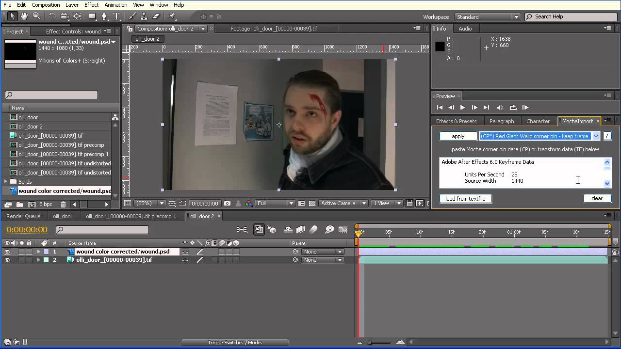 In this tutorial Mathias shows that corner pin tracking can do much more than just replacing some pictures on a wall. We are going to compose a wound on a moving head and use the Mocha tracker in combination with his script MochaImport. Trust me, this is so much easier then creating a real head wound!
