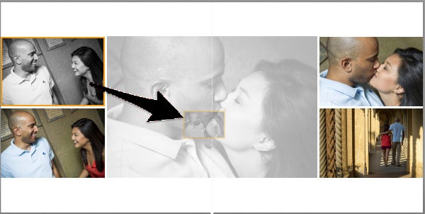This enables you to modify either the entire spread or just one side. If you drag a new photo onto the center of the spread, then it will affect the entire spread. If you drop the image onto one side, then only that side's layout will change. However, there are limits to this feature. Firstly, no image can cross the gutter. Secondly, is the applications adherence to good design conventions. So, there are instances where the whole spread will be affected when adding or removing images.