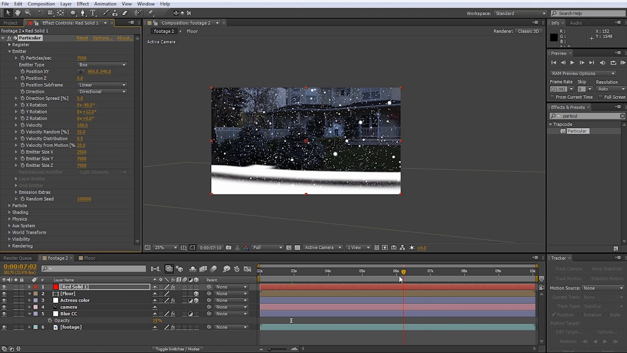 Learn how to make a realistic rainstorm effect using Trapcode Particular. The effect is subtle, but that's key to making it look good. Other things that are discussed will be how to set up a ground plane and why it's useful to use the CS6 Camera Tracker rather than the point tracker.