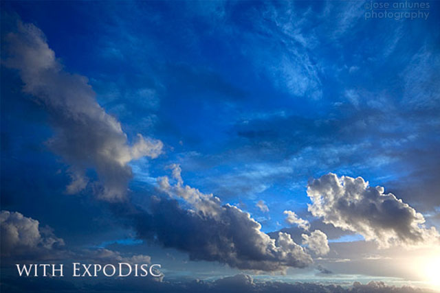 The two sky images shown here are a good example of what I mean. They were both taken at the same place and time, one of them using the ExpoDisc Professional Digital White Balance Filter from ExpoImaging to define the White Balance, the warmer image taken as my camera's auto white balance suggested.